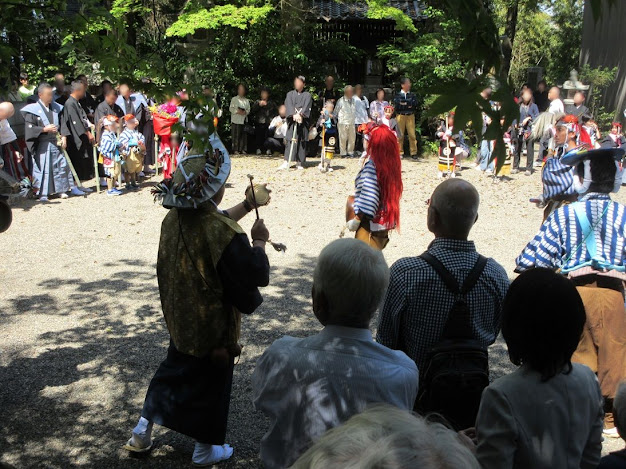 At almost the end of the ritual, two seniors who have previously played the same role in this ritual appeared and took a role of wiping away their junior’s sweat this time (green arrows). These two men are called "ita-naoshi" and their action invoked laughter from the guests. In fact, it's so strong sunshine today that the priests wiped their brow by themselves.